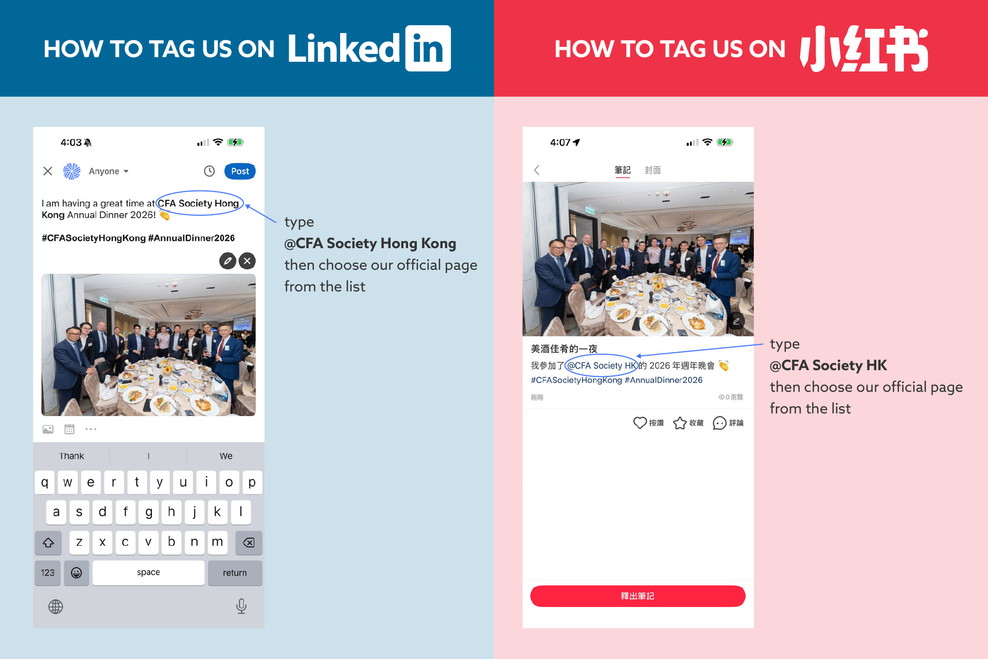 Step 3: Upload the photo to your LinkedIn or Xiaohongshu account and tag CFA Society Hong Kong (using @ in the post content). Feel free to get creative and add hashtags such as #CFASocietyHongKong #AnnualDinner2026 in your post.