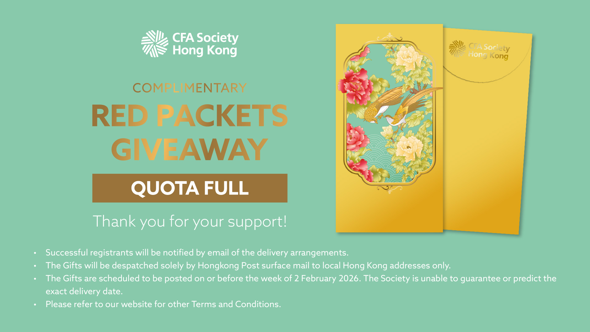 - This Red Packets Giveaway (the “Promotion”) is open exclusively to active members of CFA Society Hong Kong (the “Society”). Non-members and lapsed members are not eligible to participate.